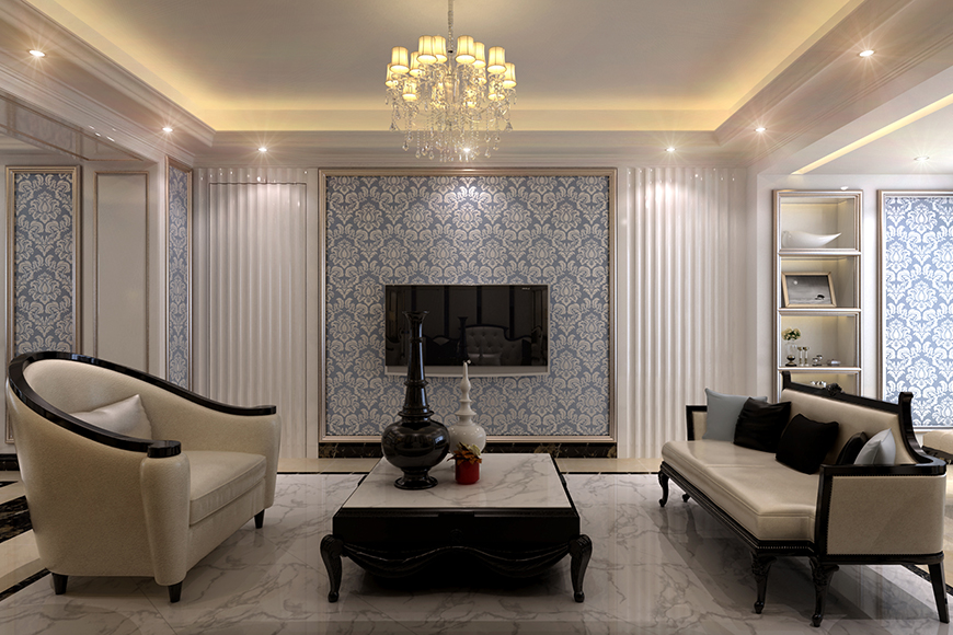 客廳電視背景以高亮度油漆面板做裝飾,配以藍(lán)色刺繡墻布,襯托出年輕、時(shí)尚、低調(diào)奢華的感覺,電視背景以軟包做為裝飾,溫馨舒適。