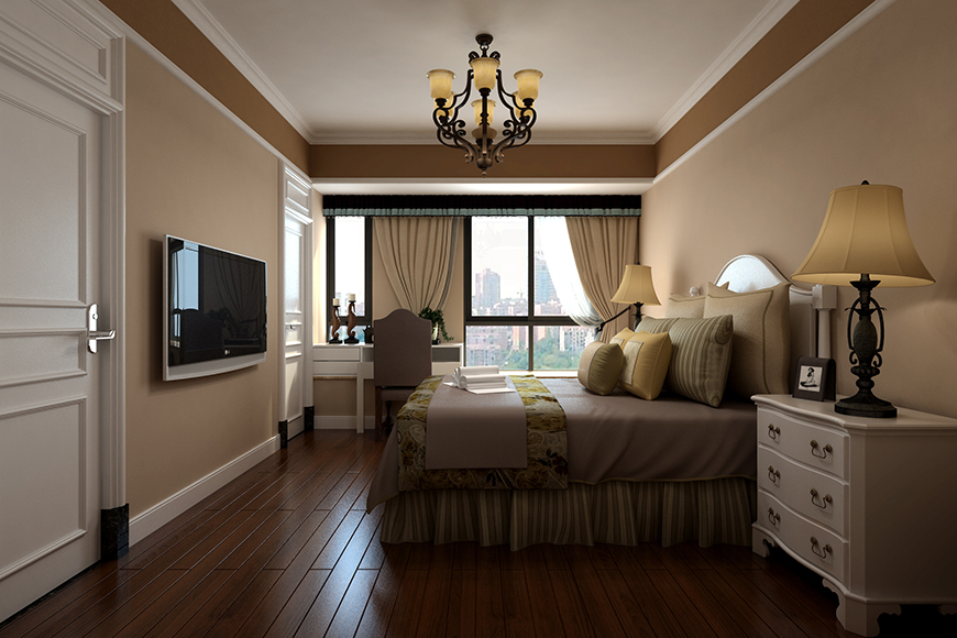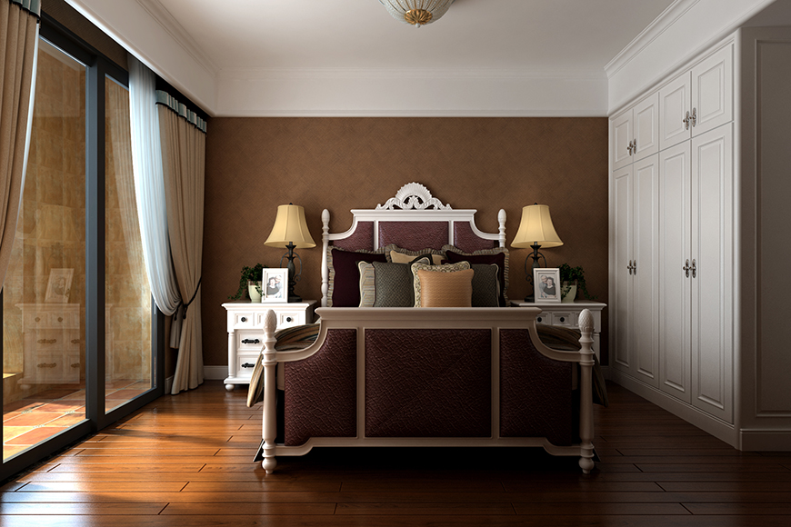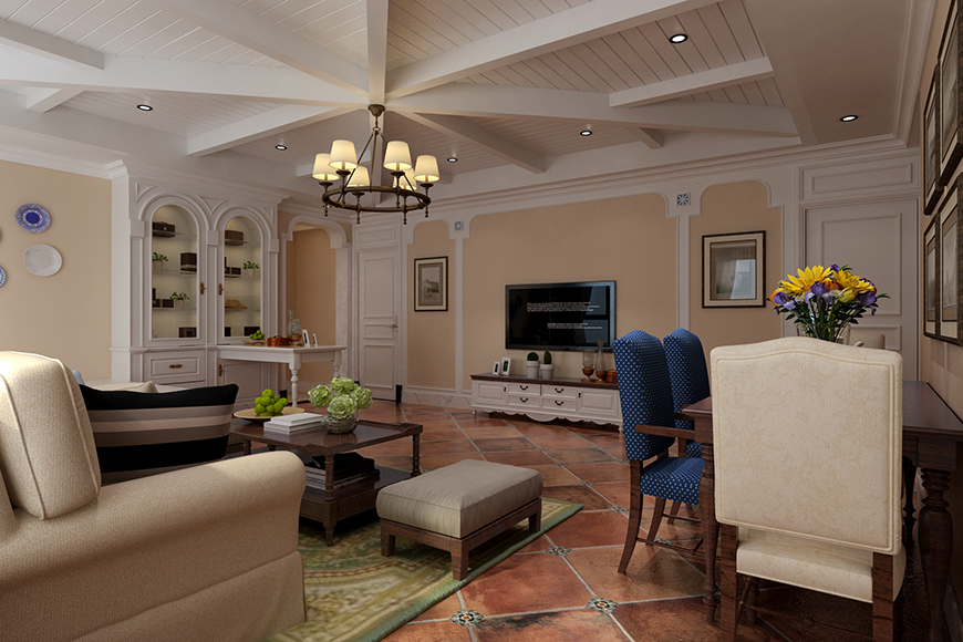 客廳以白色木作,作為基準(zhǔn)吊頂,紅色仿古磚,白色木門,給人一種濃重的美式味道,臥室有大窗戶,故以深色調(diào)為主,給人一種高貴的感覺(jué)