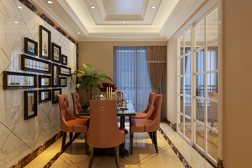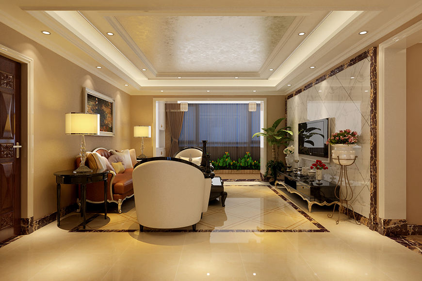 客廳以溫馨的黃色系為主,以白色瓷磚作為電視背景,天花吊頂刷銀箔,簡(jiǎn)單溫馨、而又華貴